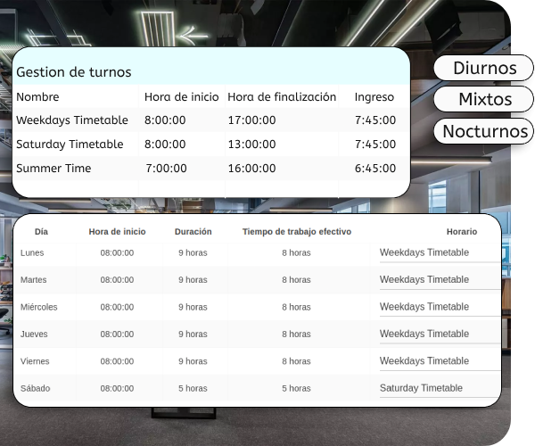 Define horarios y turnos con agilidad; planifica la jornada de tus colaboradores; gestiona conflictos; aprueba solicitudes y permisos.