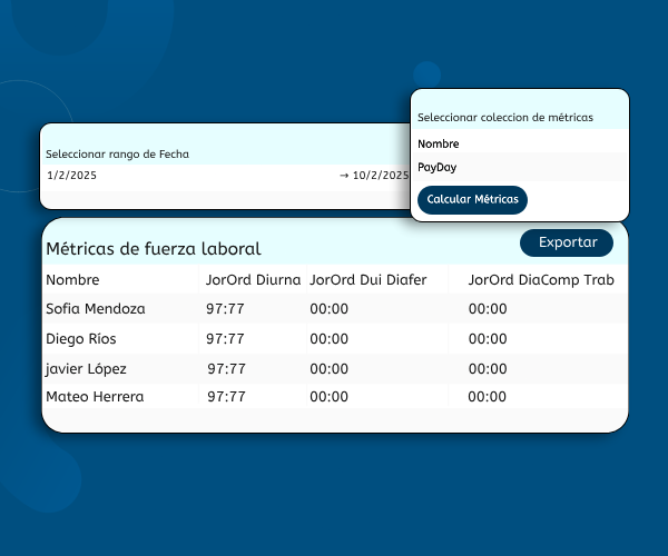 Convierte las marcaciones en horas clasificadas, listas para ser procesadas por tu sistema de planillas. Tempore se integra con tus sistemas de nómina establecidos, automatizando los cálculos y las clasificación de horas, evitando errores humanos y garantizando precisión en el cálculo del salario.